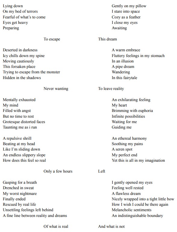 Lady Zuriel Ayebah is a creative writing student who is finishing up her junior year at Pembroke Pines Charter High School. “Sweet Dreams to my Nightmares” won first place in the Poem for Two Voices category of the 2022-23 Broward County Literary Fair.